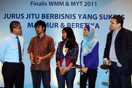 Direktur Finance and Strategy Bank Mandiri Pahala Mansury (kiri) dan Owner konsultan bisnis "I Coach The Real Coach" Yusa Aziz (kanan) berbincang dengan Finalis dan Pemenang kompetisi Wirausaha Muda Mandiri (WMM)dan Mandiri Young Technopreneur (MYT) saat pembukaan program pendampingan bisnis WMM dan MYT di Plaza Mandiri Jakarta, Senin (12/11). Sekitar 200 peserta finalis dan pemenang WMM dan MYT 2010 dan 2011 di Jakarta, Bandung dan Medan memperoleh pendampingan bisnis untuk pengembangan usaha. TEDY KROEN/RM