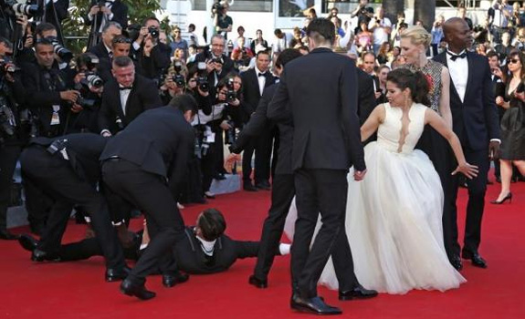 Seorang pria ditahan oleh petugas keamanan ketika mencoba masuk ke dalam gaun aktris America Ferrera ketika berpose di red carpet untuk menghadiri pemutaran film berjudul "How to Train Your Dragon 2" yang keluar dari kompetisi di Cannes Film Festival ke-67 di Cannes (Jumat, 16/5). REUTERS