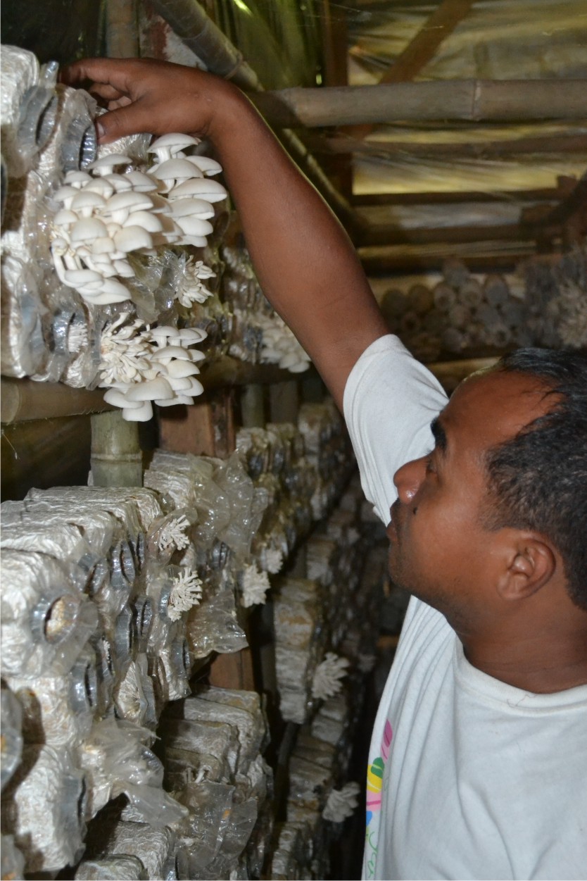Ia mengaku sudah melakukan berbagai upaya agar suhu dan kelembapan di dalam kumbung bisa terjaga. Antara lain dengan menaruh kain basah di rak-rak media tumbuh (bag log) jamur, menyiram lantai dua kali sehari dan memasang