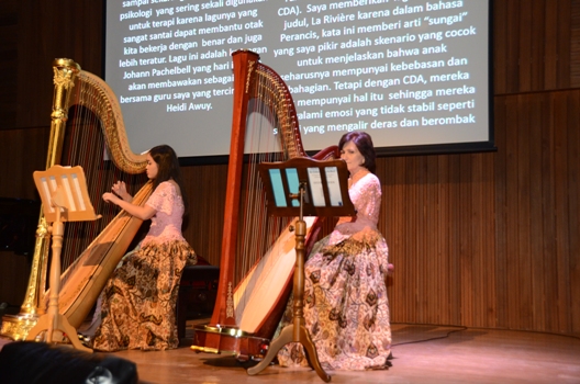 Alunan musik tersebut merupakan pembuka acara Seminar Child Domestic Abuse (Kekerasan Anak dalam Rumah Tangga) dan Harp Healing Performance di Suhanna Hall, The Energy Building, SCBD Sudirman, Minggu (8/11).
