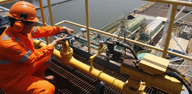 Petugas memeriksa pipa gas di Unit Pembangkitan Listrik Tenaga Gas di PJB Muara Karang, Penjaringan, Jakarta Utara, Sabtu (20/8). Saat ini beban puncak listrik di DKI Jakarta pada siang hari mencapai 7.293 MW dan pada malam hari mencapai 6.468 MW dengan jumlah pelanggan listrik sebanyak 3.914.611 pelanggan. PUTU WAHYU RAMA/RM