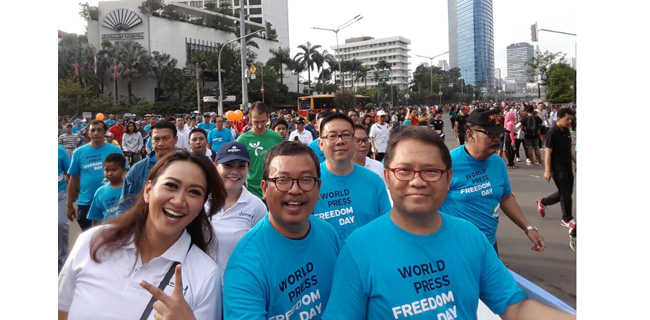 Dengan membawa spanduk berwarna biru bertuliskan "World Press Freedom Day 2017", Rudiantara dan puluhan wartawan peserta jalan santai yang juga mengenakan seragam kaus berwarna biru, berjalan dari Gedung Dewan Pers ke kawasan Bundaran Hotel Indonesia, Jalan MH Thamrin, Jakarta Pusat, Minggu (23/4) sambil sesekali menyapa warga Ibukota yang berolahraga pada saat