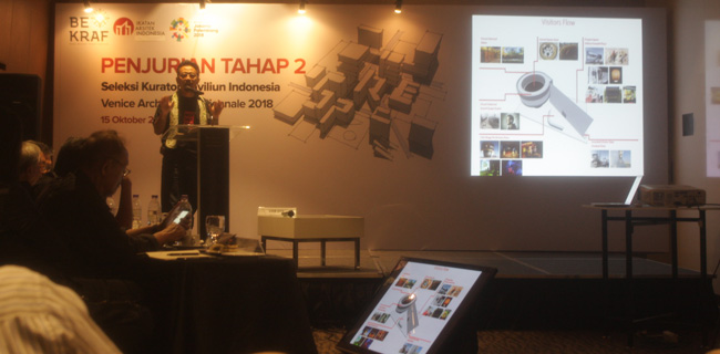 "Pameran dua tahunan yang dikenal juga dengan nama La Biennale Di Venezia, adalah salah satu pameran arsitektur bergengsi dunia. Seperti penyelenggaraan pameran sebelumnya, tahun 2018 pameran ini juga berlangsung selama enam bulan yaitu dari 26 Mei hingga 25 November 2018. Karenanya Bekraf, IAI, dan perorangan yang mewakili berbagai profesi mencari kandidat tim yang dapat memimpin proses kurasi/penyusunan materi pameran bagi Paviliun Indonesia. Tim ini harus terdiri dari arsitek dan atau desainer/seniman yang memiliki kemampuan untuk melakukan penelitian, pengembangan, desain pameran secara orisinal dan profesional," terangnya.