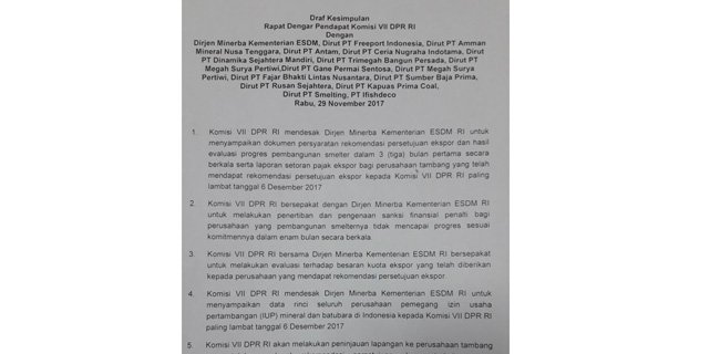 Demikian diungkapkan Direktur Eksekutif Center of Energy and Resources Indonesia (CERI), Yusri Usman, berdasarkan dokumen yang ia peroleh. Dokumen ditandatangani oleh Dirjen Minerba Kementerian ESDM, Bambang Gatot Ariyono, dan Wakil Ketua Komisi VII, Syaikhul Islam Ali .