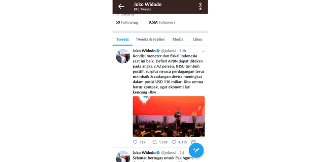 Bak artis, setiap kicauan Jokowi punya pengaruh besar di antara followers yang jumlahnya hingga sembilan jutaan.
