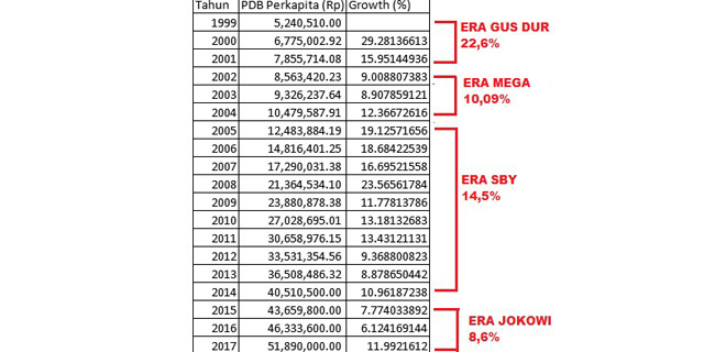 Dapat dilihat pada tabel yang tercantum pada foto berita ini, growth PDB per kapita di era Presiden Abdurrahman Wahid (Gus Dur) merupakan yang tertinggi, mencapai rata-rata 22,6% pertahun.