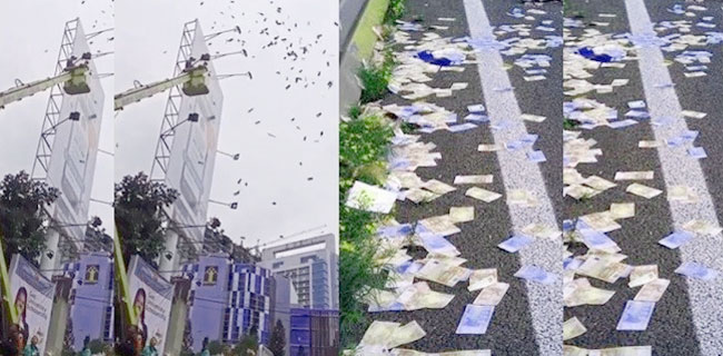 Sebuah video menjadi viral di Instagram menunjukkan, uang berhamburan dari langit. Rupanya, ada sebuah crane yang di atasnya mengangkut dua orang pria sedang menebarkan uang. Uang tersebut dari pecaÂhan Rp 10.000, Rp 5.000, dan yang paling banyak Rp 2.000.