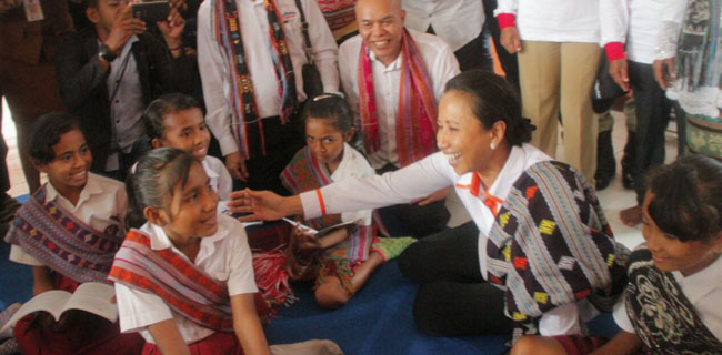 Rakyat Merdeka, yaitu Kiki Iswara Darmayana, Ratna Susilowati, Kartika Sari dan Fajar El Pradianto dengan Rini Soemarno, Selasa (6/3) di sela kunjungan ke Kupang, NTT.