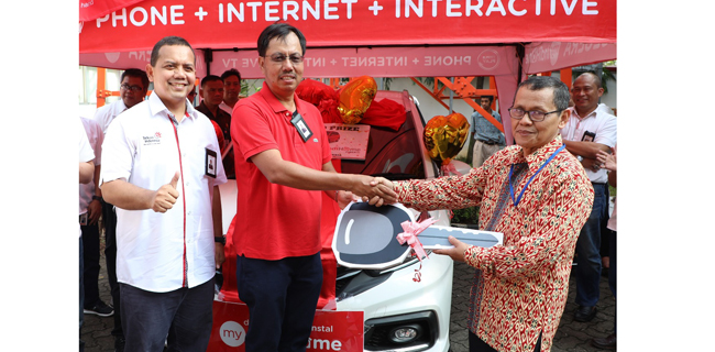 Direktur Consumer Service PT Telkom Indonesia (Persero) Tbk (Telkom) Mas'ud Khamid bersama Executive Vice President Telkom Regional Jabotabek Teuku Muda Nanta menyerahkan hadiah undian IndiHome Specta Grand Prize kepada salah satu pemenang di Jakarta, Senin (19/3).
