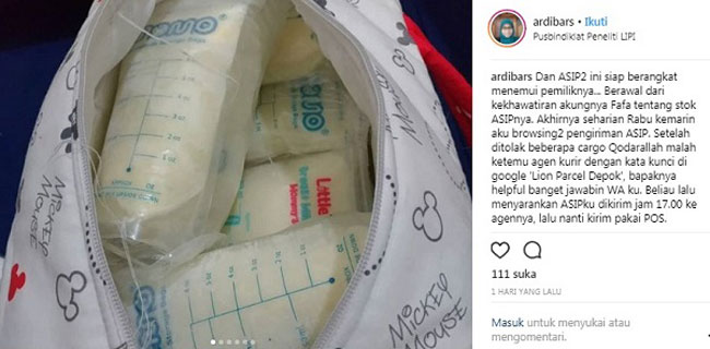 @ardibars yang beralamat di Depok ini kesulitan untuk mengirim Air Susu Ibu Perah (ASIP) ke Yogyakarta.