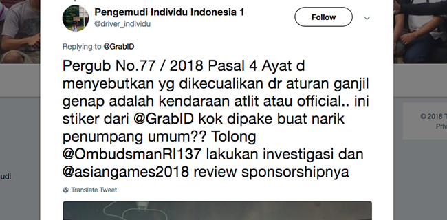 @driver_individu menuding bahwa Grab yang kini menjadi sponsor Asian Games 2018, menyalahi aturan ganjil genap.