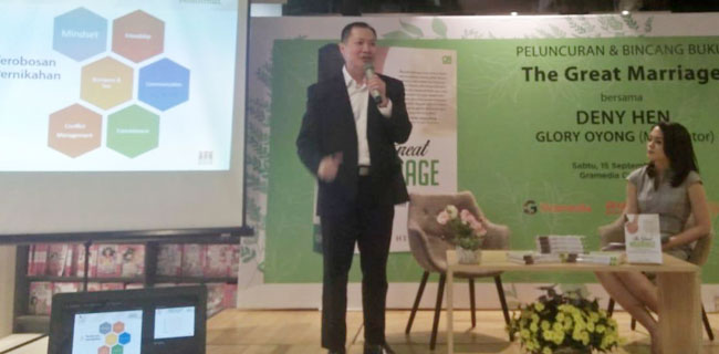 great marriage, yakni suatu pernikahan dengan visi bersama yang dapat dinikmati kedua belah pihak, sebuah hubungan yang bahagia, awet, intim dan hot setelah melewati masa cinta romatis," kata Konsultan Perkawinan dan Keluarga, Deny Han, Sabtu (15/9), saat acara peluncuran buku