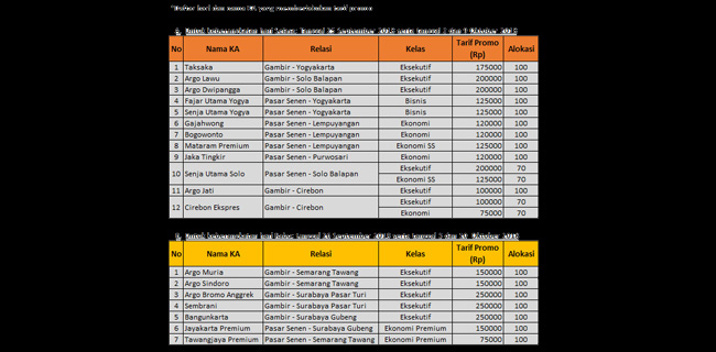 Tarif promo tersebut tidak berlaku parsial. Pemesanan dapat dilayani mulai hari ini (Senin, 24/9) melalui loket reservasi, aplikasi KAI Access, Website KAI, Vending Machine, dan Channel eksternal mitra perusahaan, dengan catatan selama tempat duduk masih tersedia.