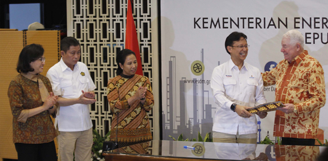 Dari kiri: Menteri Keuangan Sri Mulyani, Menteri ESDM Ignasius Jonan dan Menteri BUMN Rini Soemarno menyaksikan Dirut PT Inalum (Persero) Budi Gunadi Sadikin dan CEO Freeport Richard Adkerson menandatangani sejumlah perjanjian sebagai kelanjutan dari Pokok-pokok Perjanjian (Head of Agreement) terkait penjualan saham FCX dan hak partisipasi Rio Tinto di PT Freeport Indonesia (PTFI) ke Inalum di kantor Kementerian ESDM, Jakarta, Kamis (26/9). Kepemilikan saham Inalum atau bangsa Indonesia di Freeport naik dari 9,36 persen menjadi 51,23 persen. Dwi Pambudo/RM