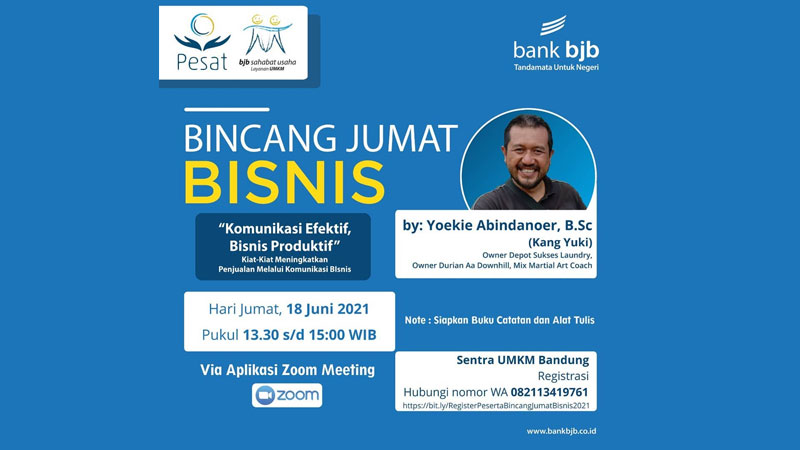 Untuk mendalami fungsi dari komunikasi bisnis tersebut bank bjb akan menyelenggarakan Bincang Jumat Bisnis Online pada 18 Juni 2021 dengan tema "Komunikasi Efektif, Bisnis Produktif".