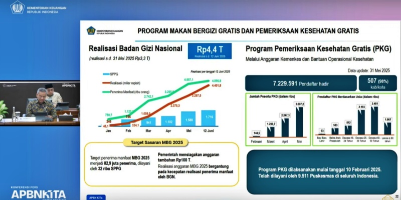 Berdasarkan bahan paparan Kementerian Keuangan, realisasi ini meningkat tajam sejak berjalannya program MBG dari Rp45,1 miliar pada Januari 2025, dan telah melonjak hingga Rp4,4 triliun hingga 12 Juni 2025.