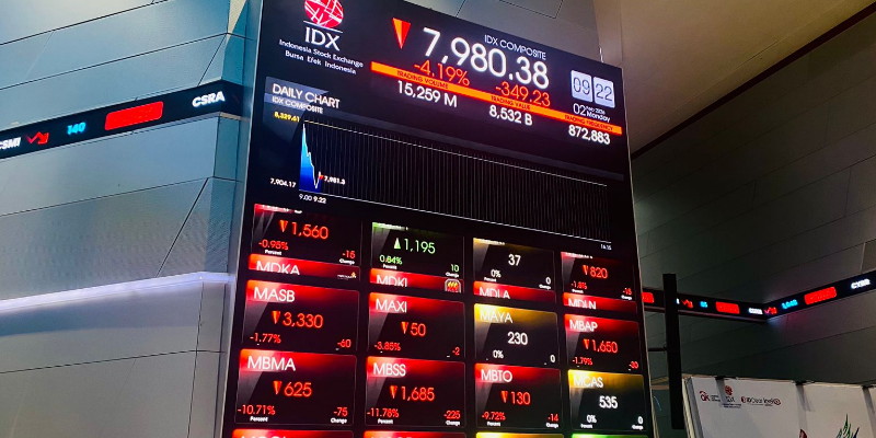 Hingga pukul 09.37 WIB, IHSG masih tertahan di zona merah dengan koreksi sebesar 3,86 persen di level 8.008. Meski pagi tadi sempat dibuka pada level 8.306 dan menyentuh titik tertinggi di 8.313, tekanan jual yang besar membawa indeks jatuh ke titik terendahnya di 7.904.