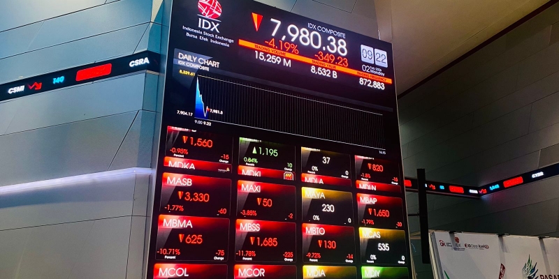 IHSG dibuka melemah ke level 7.945. Mengutip RTI Infokom, indeks tercatat turun 171 poin atau 2,11 persen. Pada awal perdagangan, IHSG bahkan sempat menyentuh level terendah di 7.888.