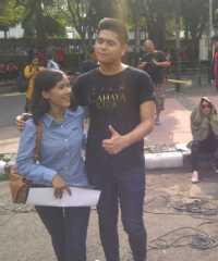 Pemeran film drama keluarga berjudul 'Cahaya Kecil', Petra Sihombing mengajak warga berfoto bersama di Bundaran Hotel Indonesia, Minggu (28/7) pagi.