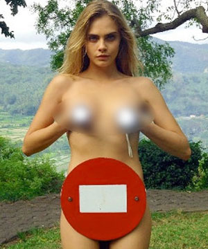Di foto yang nyaris telanjang itu terlihat, ia masih menutupi bagian tubuh intimnya dengan benda-benda unik. Bagian bawah tubuhnya ditutupi dengan rambu jalan, sedangkan bagian atas tubuhnya, ia tutupi dengan dua buah senter.