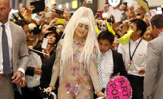 Penyanyi asal Amerika Serikat Lady Gaga berfoto dengan para penggemarnya yang menunggu di bandara internasional Narita, Tokyo Jepang pada Selasa (12/8). Kedatangannya ke Jepang adalah untuk menggelar konser di Chiba Marine Stadium pada tanggal 13 dan 14 Agustus. REUTERS