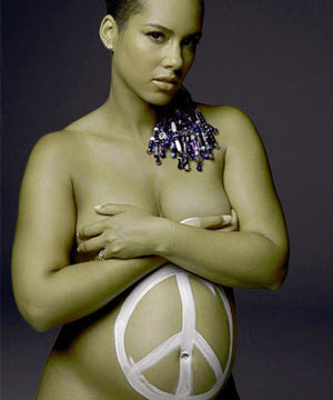 Foto tersebut memperlihatkan dengan jelas perut buncit Keys yang digambar dengan cat warna putih. Gambar tersebut berbentuk lingkaran dengan garis-garis di tengahnya. Pelantun