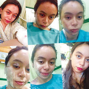 Setelah kejadian, wajah dan tubuh bagian kanannya melepuh hingga gosong. Ia pun menjalani perawatan pertama dua minggu di rumah sakit. "Lebih dari melepuh. Sebelah kanan, gosong, berminggu-minggu jadi koreng, kebakar. Di rumah sakit dua minggu, di ruÂmah satu bulan lebih nggak bisa ngapa-ngapain. Tidur juga susah harus ke kiri terus. Kuping samÂpai sekarang masih sakit," papar pesinetron