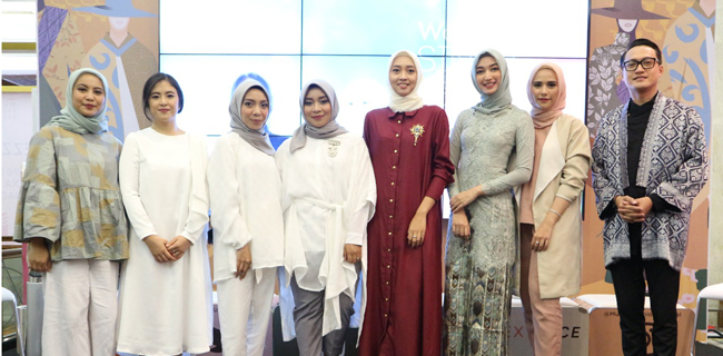 Brand Executive Wardah, Shabrina Salsabila, The Next Face Muffest Indira Hapsari, Khanaan Shamlan, Barli Asmara dan para desainer KAMI serta DINIIRA berfoto bersama di sela Muslim Fashion Festival (Muffest) 2018 di Jakarta, Minggu (22/4).