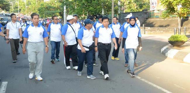 Ketua DPR RI Setya Novanto ikut ambil bagian dalam acara jalan sehat perayaan Hari Ulang Tahun (HUT) Konfederasi Serikat Pekerja Seluruh Indonesia (KSPSI) yang ke-44 di halaman kantor Gubernur Jawa Tengah, Semarang, Minggu (16/4).