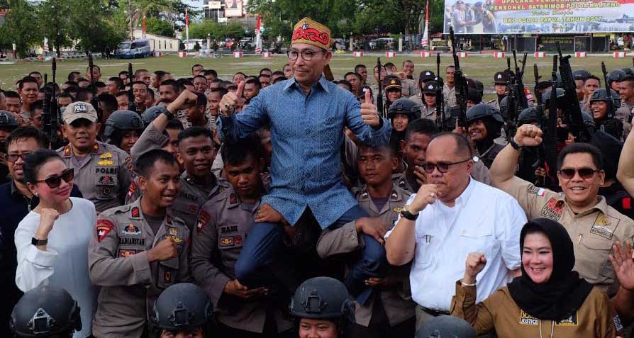 Sambil memakai ikat kepala khas Dayak yang diberikan warga setempat, politikus PDI Perjuangan itu dibopong dan duduk di atas bahu beberapa anggota polisi. Sementara dua ratusan polisi lainnya bersorak karenanya.