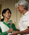 The Lady, julukan Suu Kyi dalam sebuah film yang menggambarkan perjuangan demokrasinya, menerima penghargaan itu pada Jumat malam (21/9) waktu AS. Direktur IMF Christine Lagarde secara langsung memberikan penghargaan itu kepada Suu Kyi.