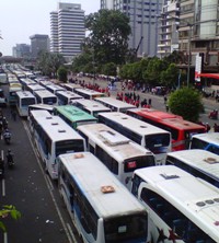Rakyat Merdeka Online dari Bundaran Hotel Indonesia menuju kawasan Monumen Nasional, Jakarta Pusat, kini berjejer ratusan bus pariwisata yang digunakan untuk mengangkut massa buruh dari luar kota.