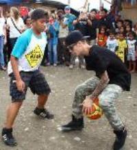 Beiber yang datang tanpa pemberitahuan sebelumnya tersebut menghibur anak-anak korban selamat dengan bernyanyi dan bermain basket bersama. Selain itu ia juga menyanyikan lagu natal bagi anak-anak di sekolah lokal yang hancur berat. Kedatangan Beiber tersebut dikawal penjagaan ketat.