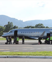 Jet pribadi Falcon 2000EX berwarna abu-abu yang berkapasitas delapan penumpang itu mampu terbang dengan kecepatan 920 kilometer per jam.