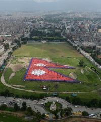 Saat lagu kebangsaan Nepal dikumandangkan, para peserta pemecah rekor bergegas mengangkat karton berwarna merah, biru, dan putih di lapangan terbuka di pusat Kota Kathmandu. Katon-katon yang diangkat kemudian membentuk gambar bendera Nepal dengan sempurna.