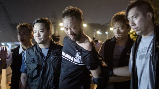 Demonstran itu diketahui belakangan bernama Ken Tsang, seorang pekerja sosial dan anggota dari partai oposisi pemerintah. Dia harus mendapat perawatan di rumah sakit akibat aksi kekerasan aparat keamanan itu.