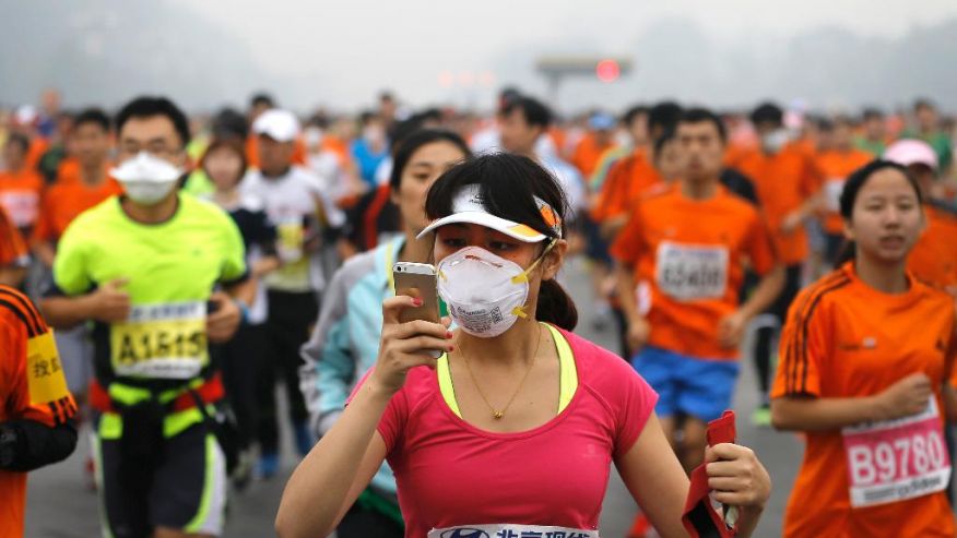 Puluhan ribu peserta Beijing International Marathon ke-34 terpaksa menggunakan masker untuk tetap bertarung dalam lomba lari yang dimulai di Lapangan Tiananmen dan berakhir di Olympic Park. Dari garis start hingga finish, berjarak 42 kilometer.
