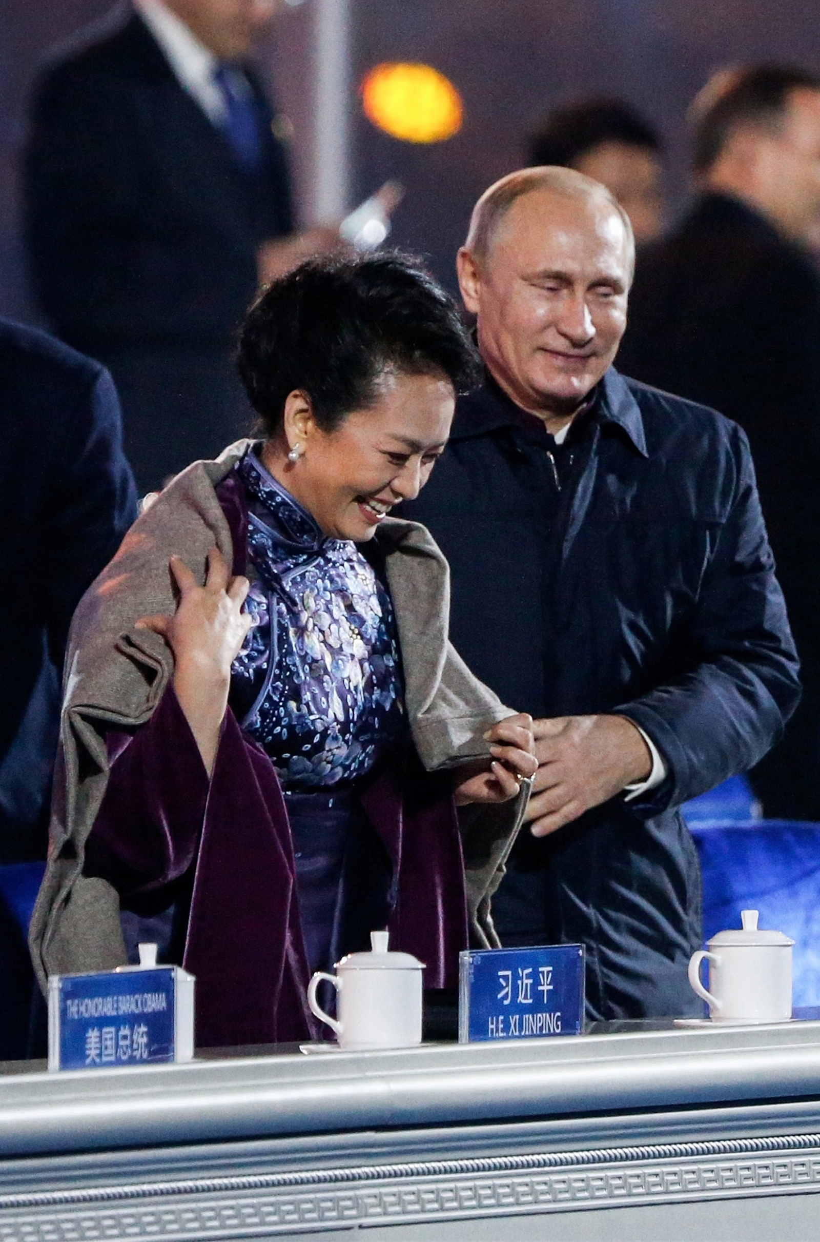 Dalam sebuah video yang ditampilkan media-media online internasional, tampak Peng Liyuan duduk diapit suaminya Presiden Xi Jinping sekitar satu meter di sebelah kanannya dan Putin lebih dekat di sebelah kirinya.
