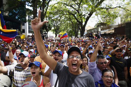 Telesur TV, saluran televisi internasional di Caracas, kelompok oposisi sayap kanan sebenarnya merayakan setahun perjuangan mereka menentang pemerintahan Maduro yang dimulai sejak 12 Februari 2014 dengan aksi turun ke jalan.