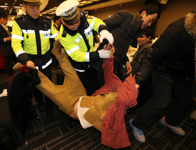 Dalam aksinya Kim berteriak menentang rencana latihan militer gabungan Korea Selatan dan Amerika Serikat di Semenajung Korea awal pekan depan.
