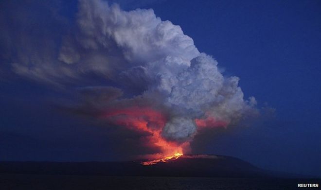 Gunung Serigala di Pulau Isabela, Galapagos itu meletus awal pekan ini untuk pertama kalinya dalam kurun waktu 33 tahun terakhir. Letusan gunung memuntahkan asap dan lava panas.
