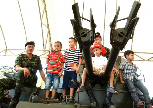 AsiaOne, anak-anak yang datang ke markas militer dijamu dengan baik oleh para tentara, Mereka dihubur dengan makanan, penampilan udara serta pameran senjata militer.