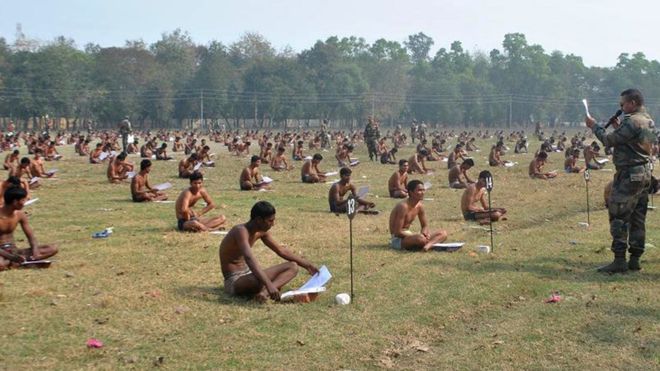 Para pemuda tersebut hanya diperbolehkan mengenakan celana pendek saat mengerjakan tes rekrutmen yang dillakukan di sebuah lapangan di kota Muzaffarpur.