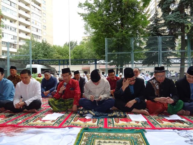 Salat Idul Fitri di KBRI Moskow dilakukan lebih cepat dari di tanah air Indonesia karena mengikuti Keputusan Dewan Mufti Rusia yang menetapkan 1 Syawal 1437 H jatuh pada Selasa 5 Juli 2016.