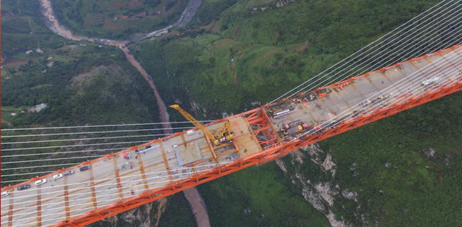 Jembatan yang membentang 1.341 meter tersebut diprediksi akan membuka lalu lintas pada akhir tahun ini dan akan memotong jalan perjalanan dari Liupanshui di Guizhou untuk Xuanwei di provinsi Yunnan dari semula lima jam menjadi kurang dari dua jam.