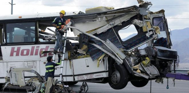 Kecelakaan terjadi saat bus wisata menabrak bagian belakang truk dengan kecepatan tinggi dalam perjalanan menunju Los Angeles.