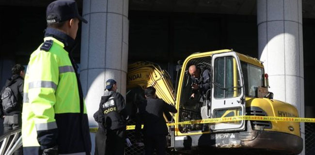 Kendaraan berat sempat melukai seorang petugas keamanan dan melukai sebagian kecil bangunan.
