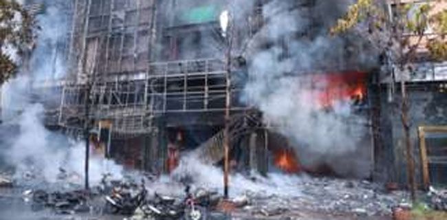 Api menjalar ke tiga bangunan tetangga, membakar mobil dan sepeda motor di jalan.