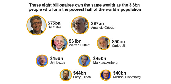 Menurut Oxfam, kekayaan Bill Gates, Amancio Ortega, Warrent Buffett, Carlos Slim, Jeff Bezos, Mark Zukerberg, Larry Ellison dan Michael Bloomberg jika disatukan maka akan setara dengan kekayaan sekitar 3,6 miliar orang miskin di dunia.
