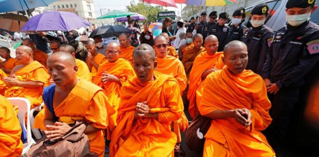 Petugas memasuki situs Kuil Dhammakaya di pinggiran Bangkok setelah upaya sebelumnya digagalkan ketika ribuan umat biarawan itu menghadang.